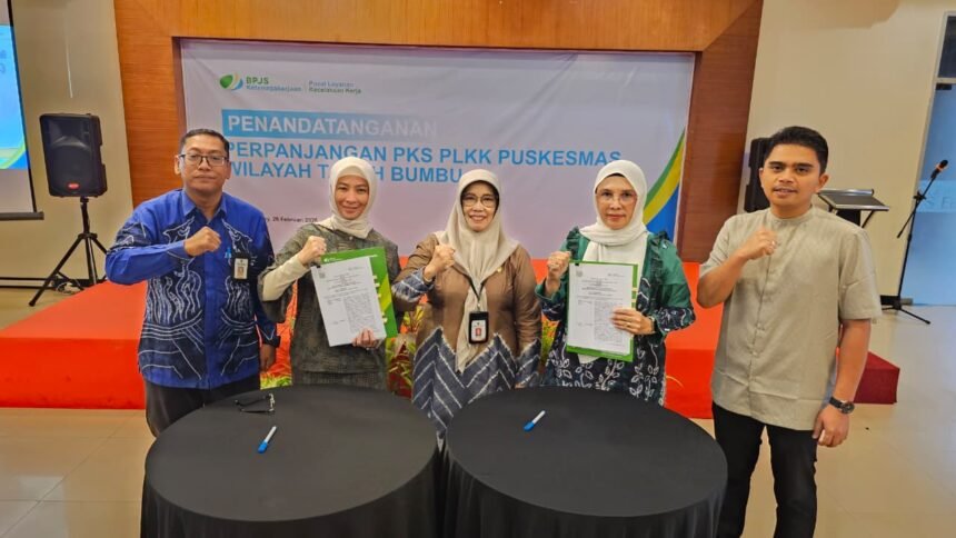 BPJS Ketenagakerjaan Cabang Batulicin menyelenggarakan kegiatan penandatanganan perpanjangan Perjanjian Kerja Sama Pusat Layanan Kecelakaan Kerja (PLKK) Puskesmas se-Kabupaten Tanah Bumbu. Kegiatan ini dihadiri oleh Kepala Dinas Kesehatan Kabupaten Tanah Bumbu dan Kepala Puskesmas se-Kabupaten Tanah Bumbu atau yang mewakili. Pada kesempatan yang sama, disosialisasikan Standarisasi Layanan Program Jaminan Kecelakaan Kerja (JKK) melalui PLKK dalam rangka memperkuat perlindungan Jaminan Kecelakaan Kerja…