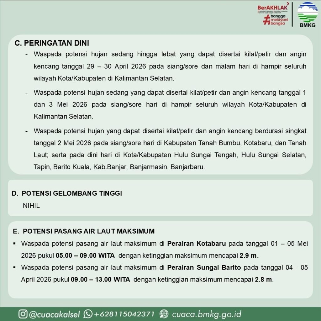 “Kami mengimbau masyarakat untuk waspada potensi hujan sedang hingga lebat yang dapat disertai kilat/petir dan angin kencang pada tanggal 29 hingga 30 April 2026, terutama pada siang hingga malam hari di hampir seluruh wilayah Kalimantan Selatan,” ungkap Putri.