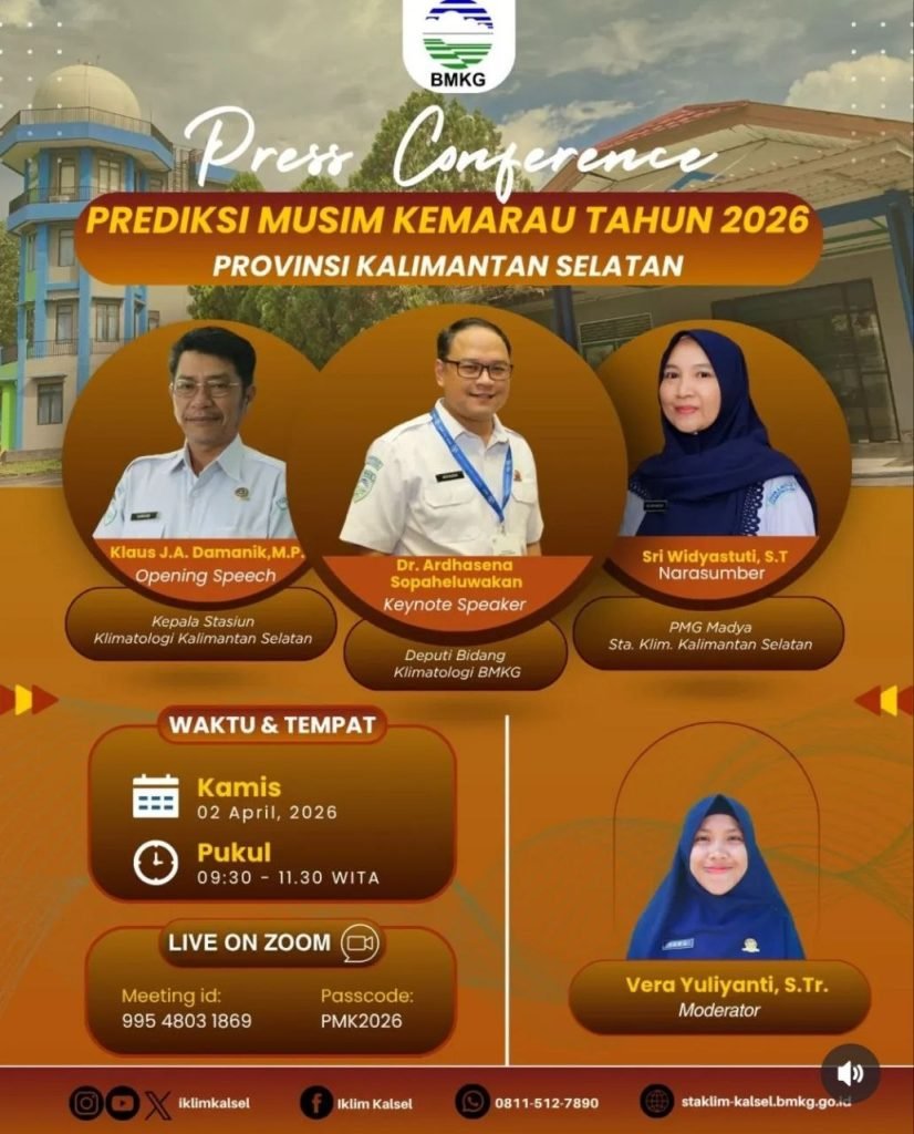 Hal tersebut disampaikan pada Diseminasi Informasi Prediksi Musim Kemarau Tahun 2026 Provinsi Kalimantan Selatan secara virtual, Kamis (2/4/2026).
