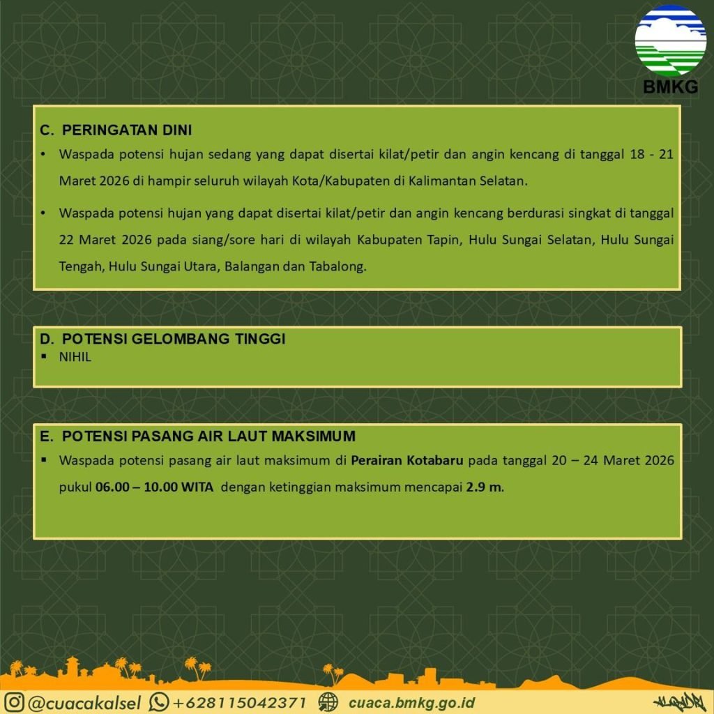 “Masyarakat dapat mengakses aplikasi Info BMKG, situs resmi cuaca.bmkg.go.id, serta media sosial Instagram @cuacakalsel untuk informasi lebih lanjut,” tutupnya. MC Kalsel/Fuz