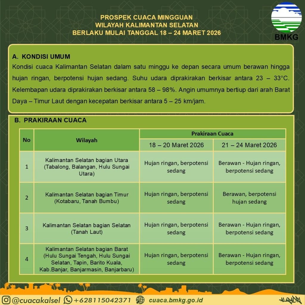 Kepala BMKG Stasiun Meteorologi Syamsudin Noor, Ota Welly Jenny Thalo melalui prakirawan Rianita Sekar Utami menyampaikan prospek cuaca mingguan wilayah Kalimantan Selatan yang berlaku pada 18–24 Maret 2026, berdasarkan pembaruan per 17 Maret 2026.