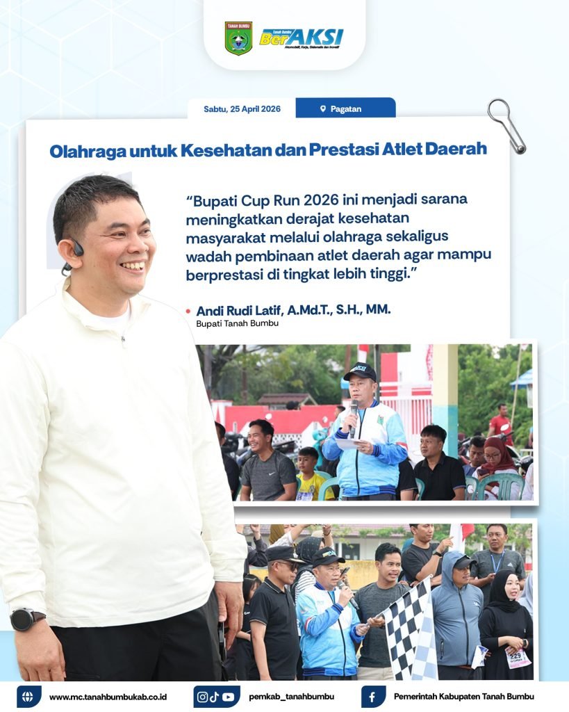 BATULICIN – Pemerintah Kabupaten Tanah Bumbu kembali menunjukkan komitmennya dalam mendorong gaya hidup sehat dan pengembangan prestasi olahraga melalui penyelenggaraan Bupati Cup Run 5K 2026 yang berlangsung meriah di Pagatan, Kecamatan Kusan Hilir, Sabtu (25/4/2026).