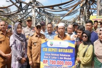 Bupati Kotabaru, Kalimantan Selatan, M Rusli menyerahkan bantuan senilai Rp700 juta pasca…