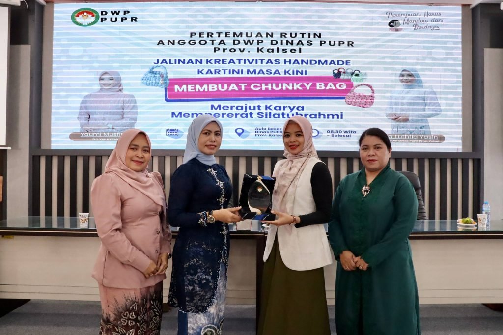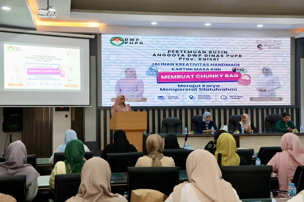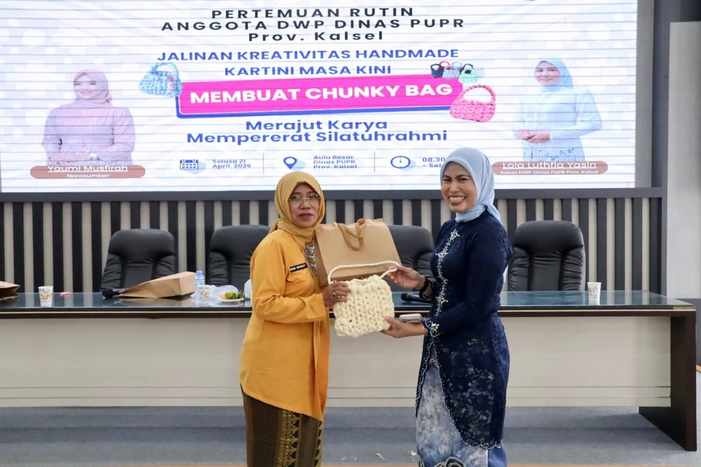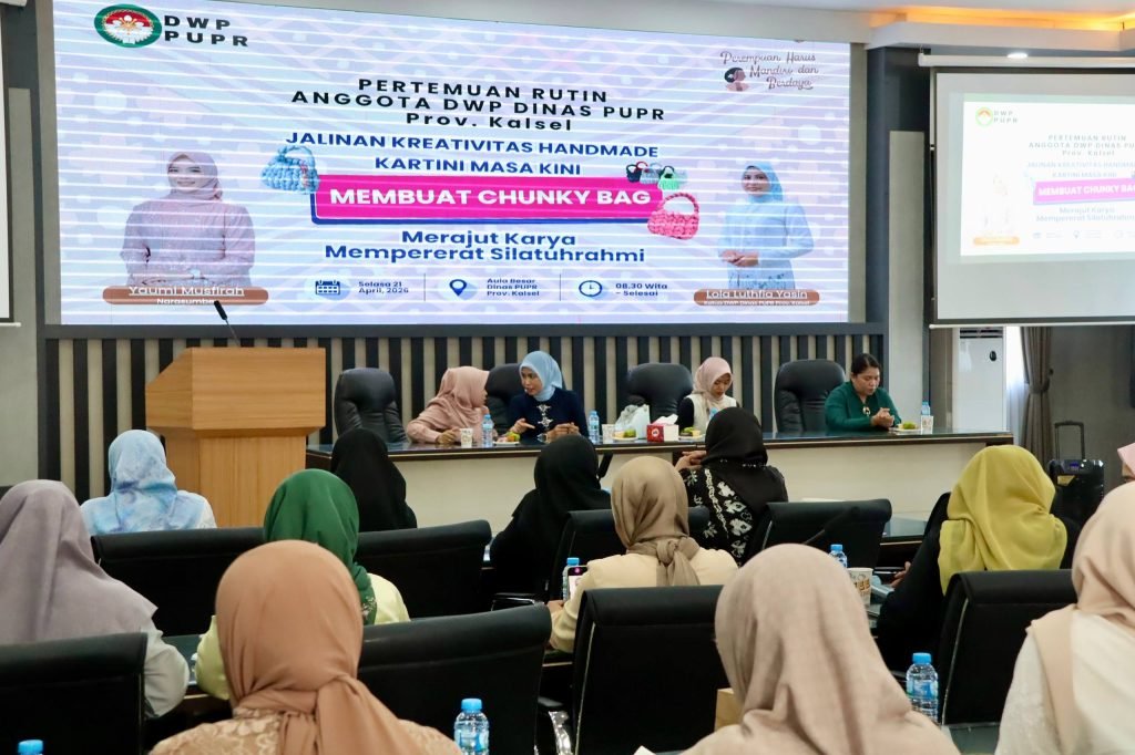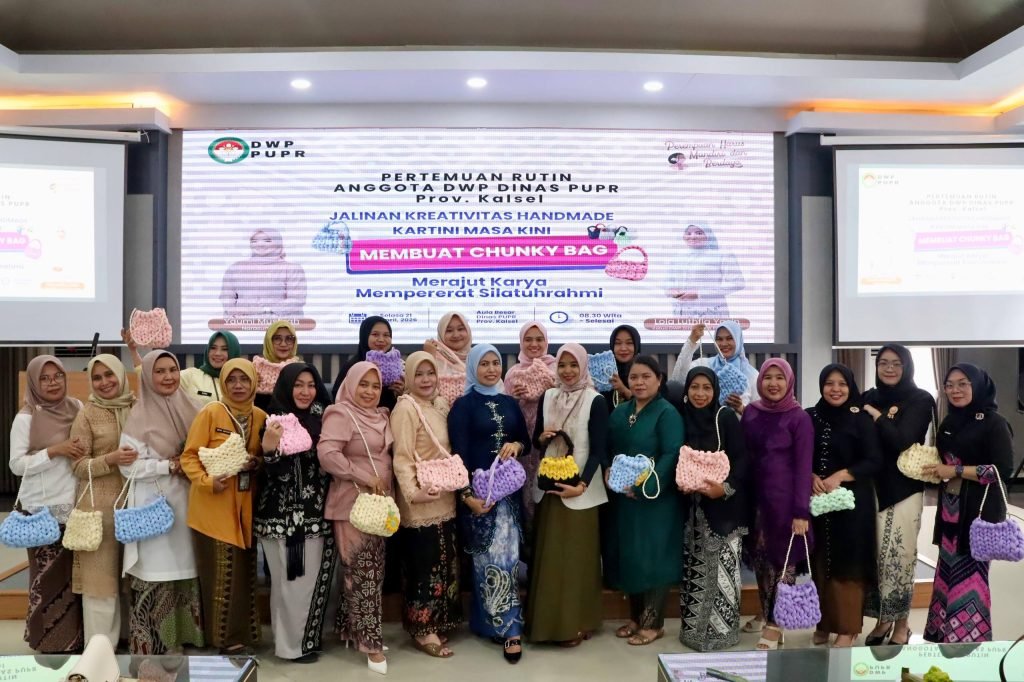 Dharma Wanita Persatuan (DWP) Dinas Pekerjaan Umum dan Penataan Ruang (PUPR) Provinsi Kalimantan Selatan (Kalsel) menggelar pertemuan rutin yang dirangkai dengan kegiatan keterampilan membuat kerajinan tangan berupa chunky bag di Aula Kantor PUPR Kalsel, Banjarbaru, Selasa (21/4/2026).