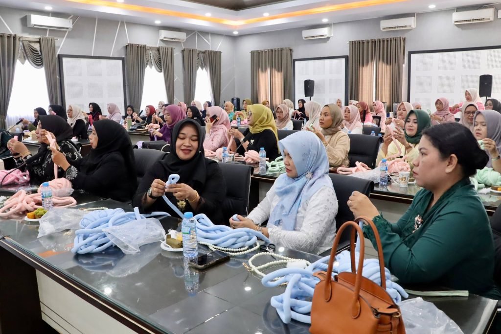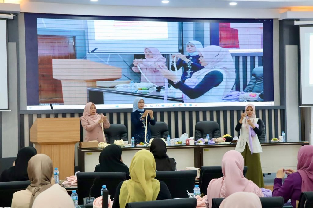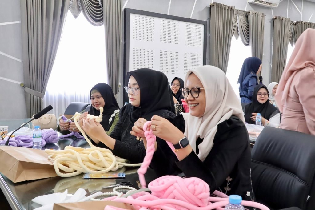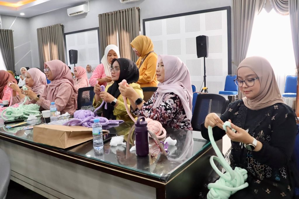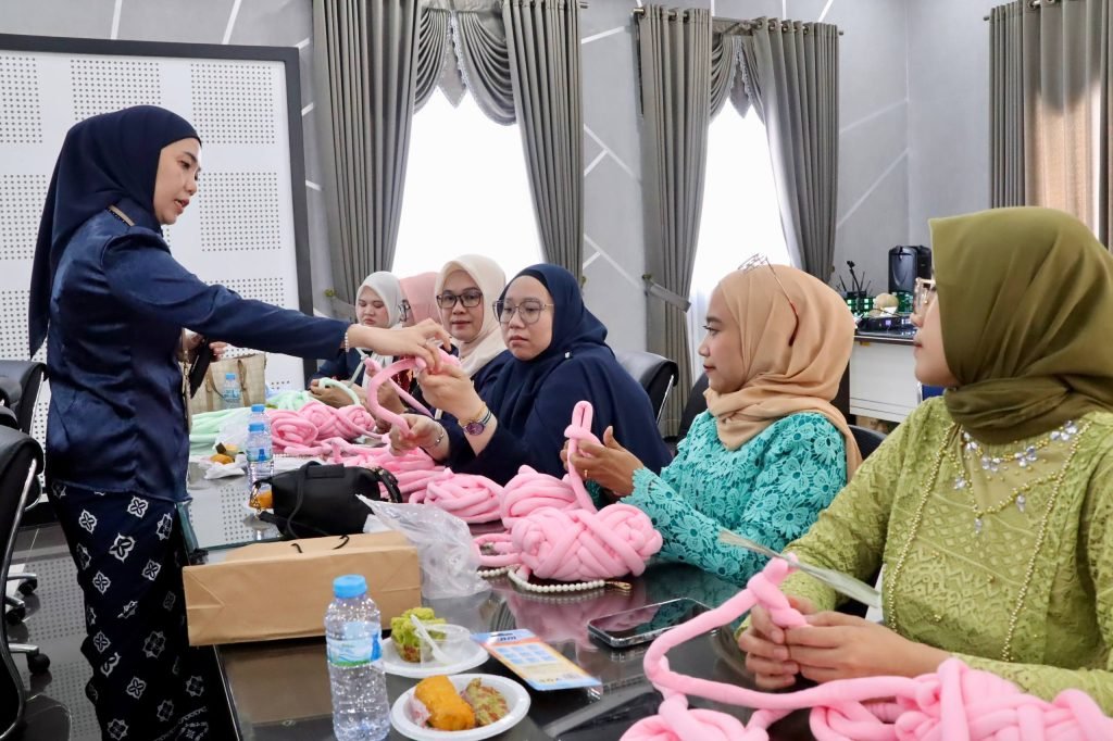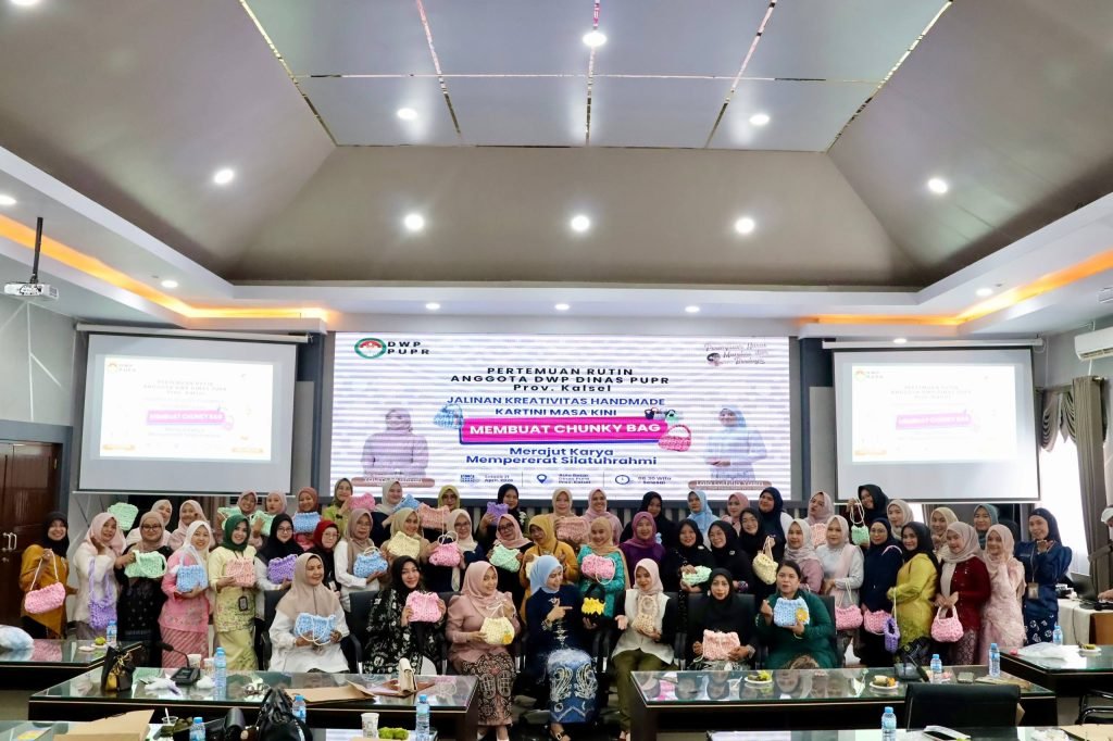 Dharma Wanita Persatuan (DWP) Dinas Pekerjaan Umum dan Penataan Ruang (PUPR) Provinsi Kalimantan Selatan (Kalsel) menggelar pertemuan rutin yang dirangkai dengan kegiatan keterampilan membuat kerajinan tangan berupa chunky bag di Aula Kantor PUPR Kalsel, Banjarbaru, Selasa (21/4/2026).