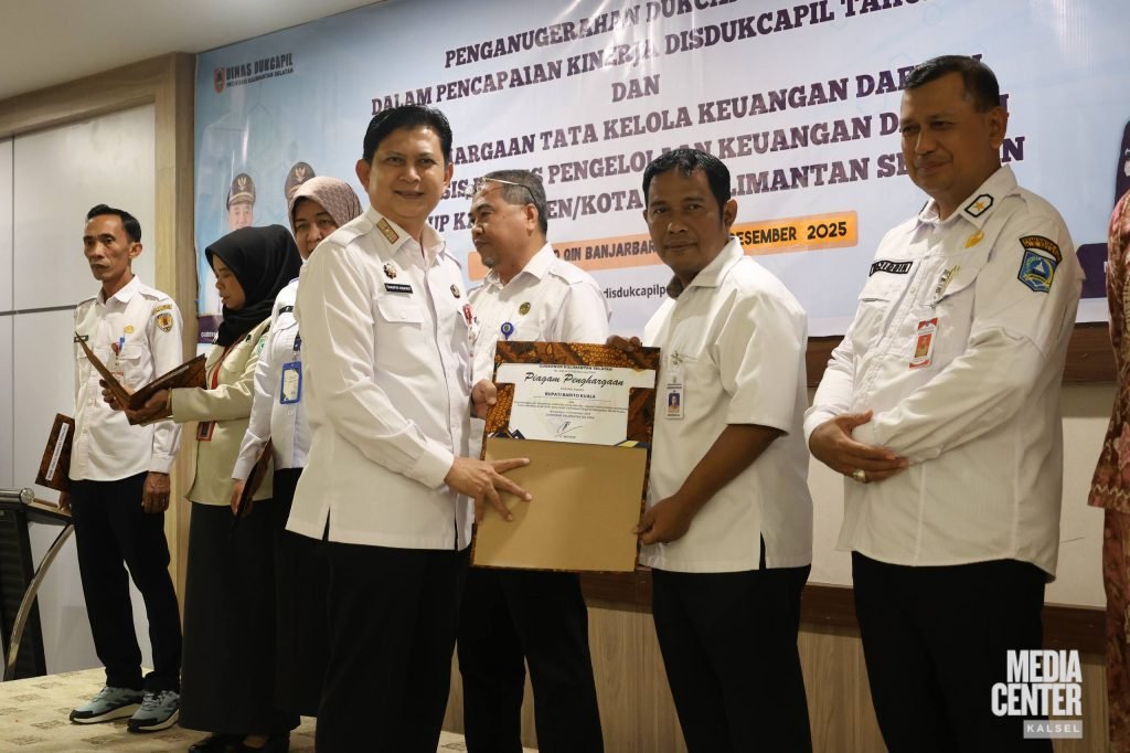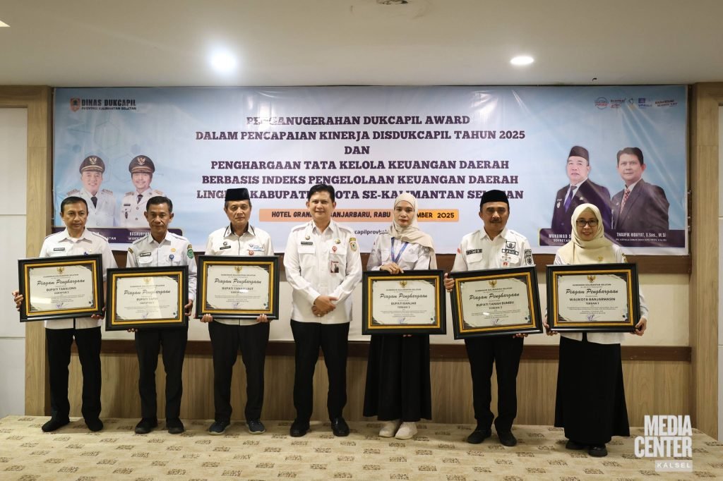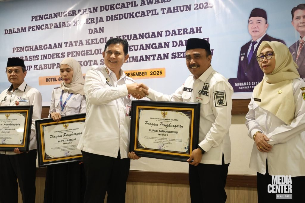 Pemerintah Provinsi Kalimantan Selatan melalui Dinas Kependudukan dan Pencatatan Sipil Provinsi Kalsel dan Badan Riset dan Inovasi Daerah (BRIDA) Provinsi Kalsel menyerahkan Penganugerahan Indeks Pengelolaan Keuangan Daerah (IPKD) Tahun Anggaran 2024, Tahun Ukur 2025 kepada kabupaten/kota se-Kalimantan Selatan di Banjarbaru, Rabu (10/12/2025).