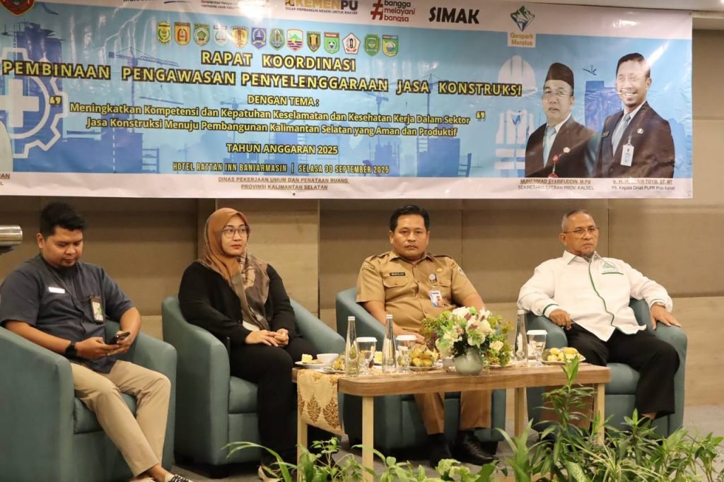 Upaya mewujudkan pembangunan yang aman, berkualitas, dan produktif terus digencarkan oleh Pemerintah Provinsi Kalimantan Selatan melalui Dinas Pekerjaan Umum dan Penataan Ruang Kalsel. Salah satunya melalui Rapat Koordinasi Pembinaan dan Pengawasan Penyelenggaraan Jasa Konstruksi dengan mengusung tema “Meningkatkan Kompetensi dan Kepatuhan Keselamatan dan Kesehatan Kerja Sektor Jasa Konstruksi Menuju Pembangunan Kalsel yang Aman dan Produktif.” di Banjarmasin, Selasa (30/9/2025).