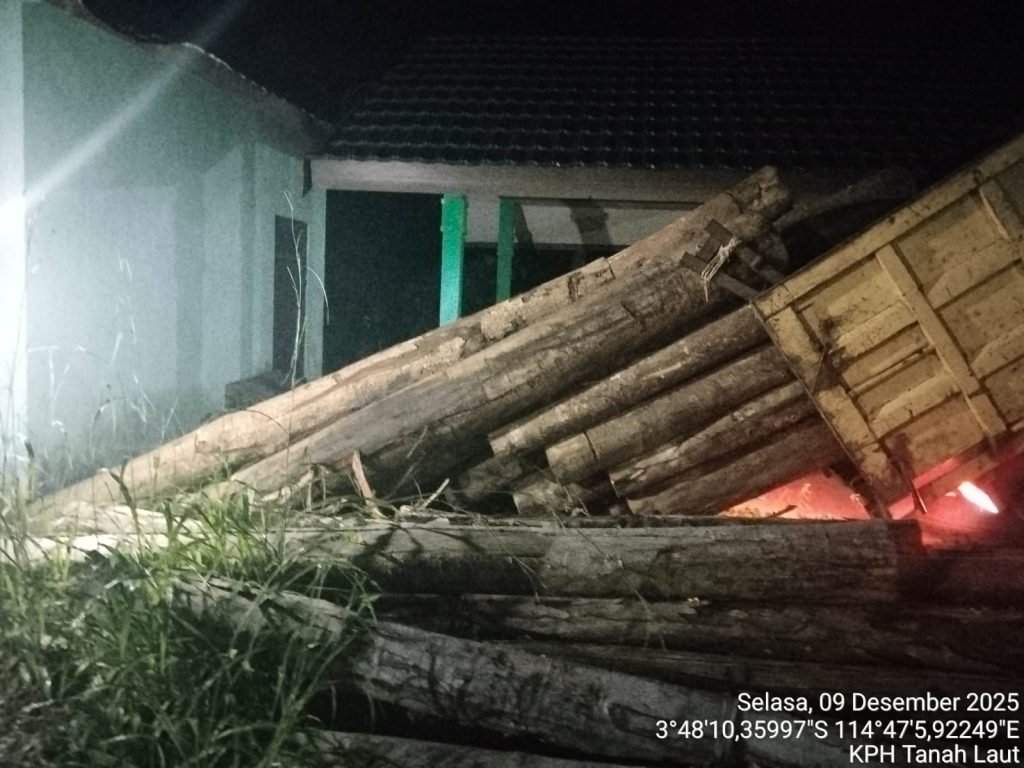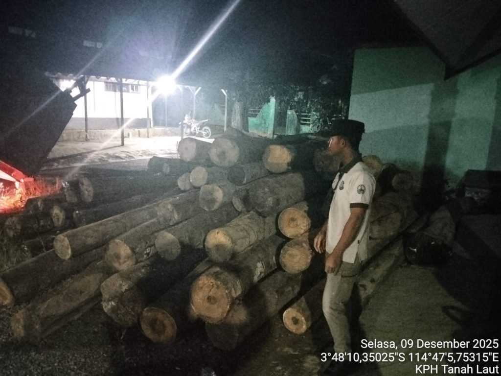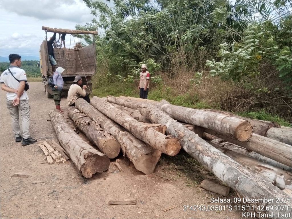 Kesatuan Pengelolaan Hutan (KPH) Tanah Laut mengamankan puluhan batang kayu yang diduga berasal dari aktivitas penebangan ilegal saat patroli pengamanan kawasan hutan di Desa Riam Adungan, Kecamatan Kintap, Kabupaten Tanah Laut, Jumat (12/12/2025).