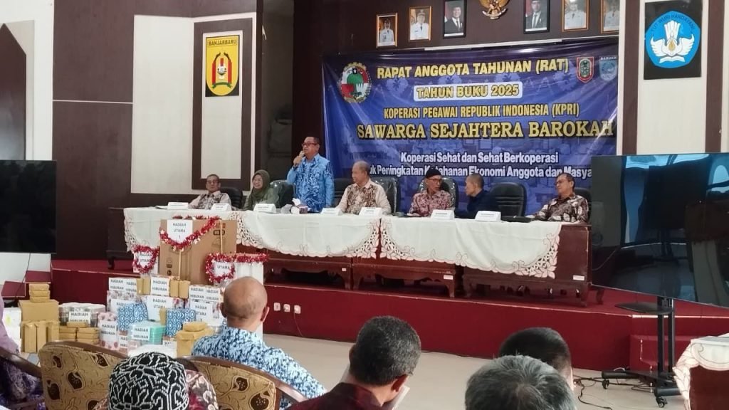 Pelaksana Tugas (Plt) Kepala Dinas Koperasi dan UKM Provinsi Kalimantan Selatan, Ahmad Bagiawan, menghadiri sekaligus memberikan arahan pada Pembukaan Rapat Anggota Tahunan (RAT) Tahun Buku 2025 Koperasi Pegawai Republik Indonesia (KPRI) Sawarga Sejahtera Barokah, Sabtu (28/2/2026), di Aula Widyatama Dinas Pendidikan Kota Banjarbaru.