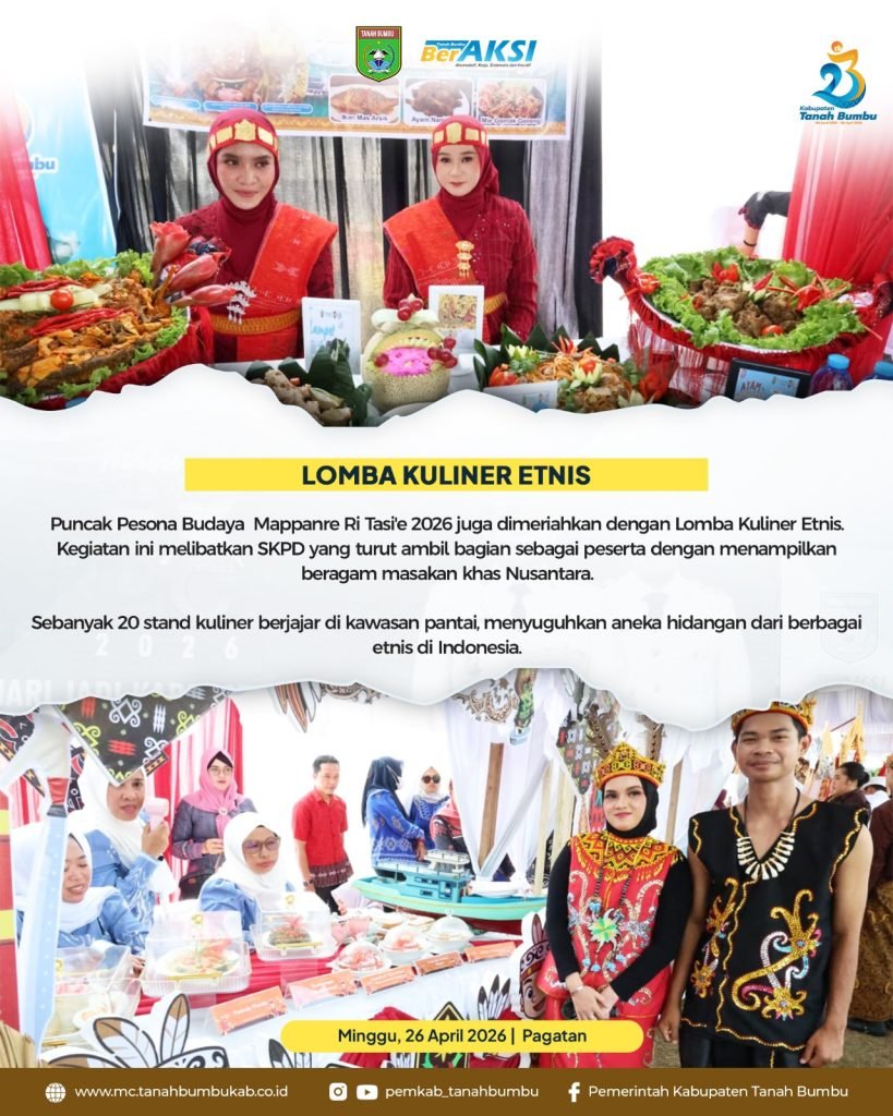 BATULICIN – Lomba Kuliner Etnis menjadi salah satu daya tarik utama dalam puncak Pesona Budaya Mappanre Ri Tasi’e 2026 sekaligus dalam rangka memeriahkan hari Jadi ke-23 Tanah Bumbu yang digelar di Pantai Pagatan, Minggu (26/04/2026).