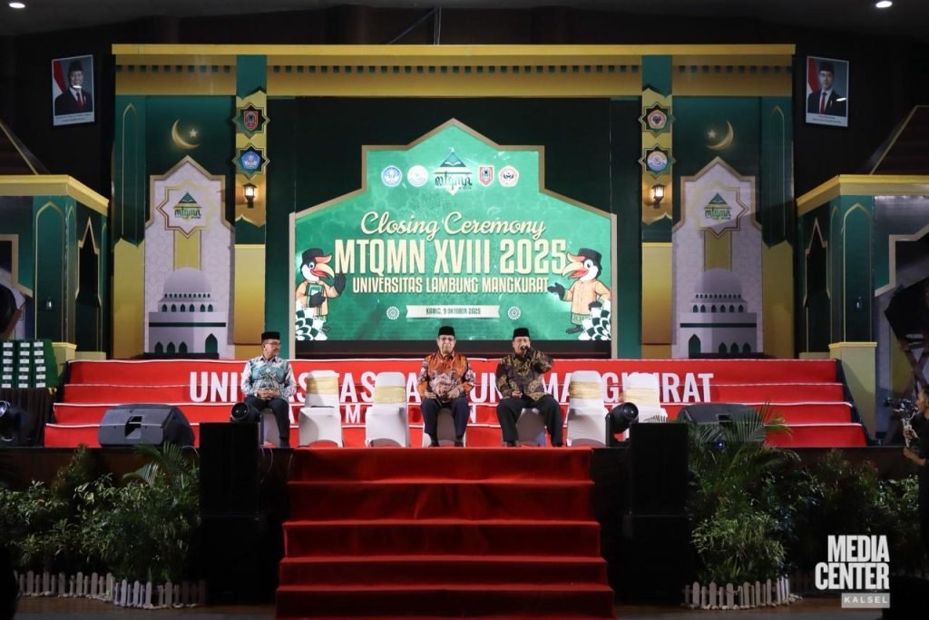 Musabaqah Tilawatil Qur’an Mahasiswa Nasional (MTQMN) ke-XVIII Tahun 2025 resmi ditutup di Auditorium Universitas Lambung Mangkurat (ULM) Banjarbaru, Kamis (9/10/2025). Kegiatan yang berlangsung selama empat hari sejak 6 Oktober 2025 ini diikuti oleh 1.506 kafilah dari 194 perguruan tinggi di seluruh Indonesia.