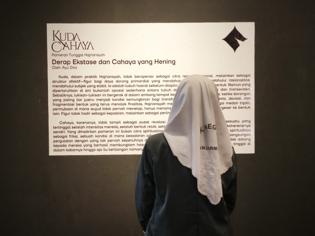 Pemerintah Provinsi Kalimantan Selatan memberikan apresiasi terhadap pameran seni rupa bertajuk Kuda Cahaya karya perupa Hajriansyah yang digelar di UPTD Taman Budaya Kalimantan Selatan. Pameran ini dinilai tidak hanya menjadi ajang menampilkan karya visual, tetapi juga ruang refleksi yang sarat makna filosofis dan religius.