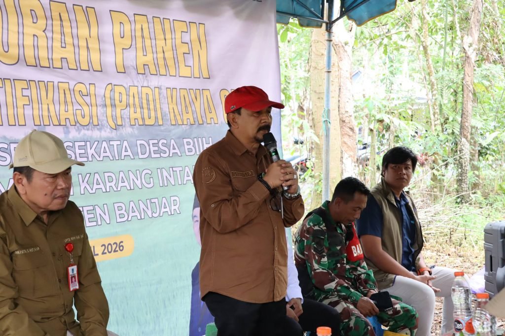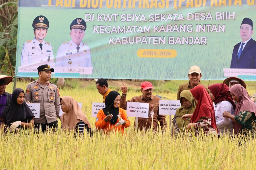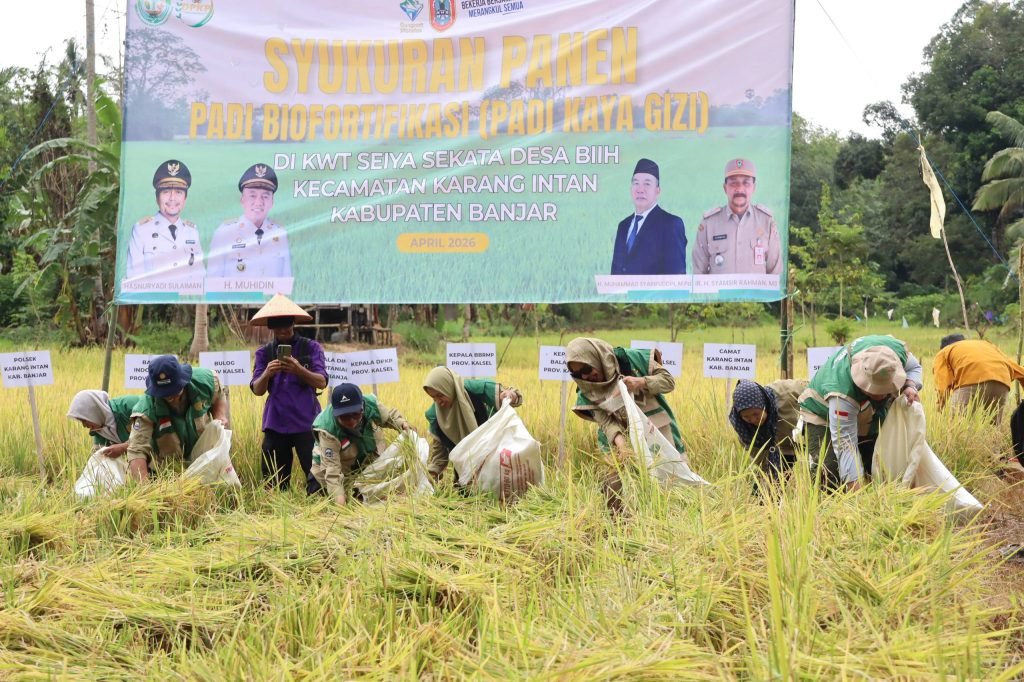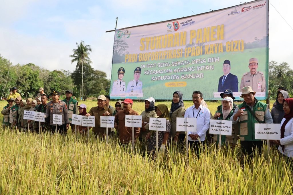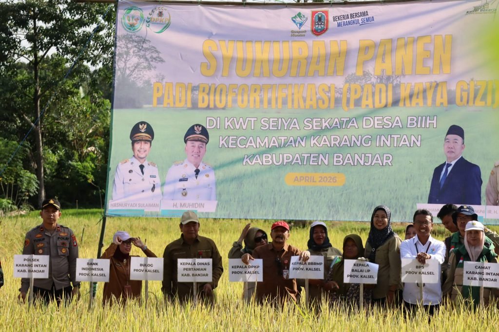 Dinas Pertanian dan Ketahanan Pangan Provinsi Kalimantan Selatan (Kalsel) menggelar syukuran panen padi biofortifikasi (padi kaya gizi) bersama Kelompok Wanita Tani (KWT) Seiya Sekata di Desa Biih, Kecamatan Karang Intan, Kabupaten Banjar, Selasa (7/4/2026).