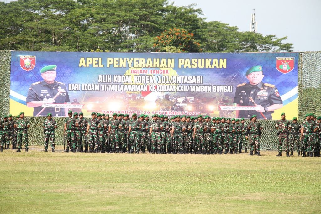 Pangdam VI/Mulawarman Mayjen TNI Rudy Rachmat Nugraha, mendampingi Pangdam XXII/Tambun Bungai, Mayjen TNI Zainul Arifin, yang memimpin apel gelar pasukan dalam rangka alih komando pengendalian (Kodal) Korem 101/Antasari dari Kodam VI/Mulawarman kepada Kodam XXII/Tambun Bungai. Upacara berlangsung di Lapangan Kantor Gubernur Kalimantan Selatan, Banjarbaru, dengan dihadiri jajaran Forkopimda, kepala instansi, bupati/wali kota se-Kalimantan Selatan, serta unsur TNI-Polri.