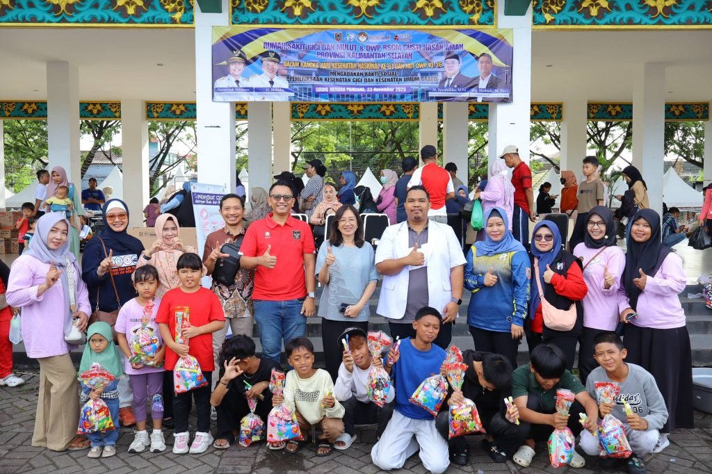 RSGM Gusti Hasan Aman menegaskan komitmen dalam mendukung upaya penurunan stunting di Kalimantan Selatan melalui edukasi kesehatan gigi sejak dini. Komitmen tersebut disampaikan dalam kegiatan Bakti Sosial Pemeriksaan Gigi dan Kesehatan Umum Gratis yang bertepatan dengan HKN ke-61 dan HUT DWP ke-26 di Siring Menara Pandang, Banjarmasin, Minggu (23/11/2025).
