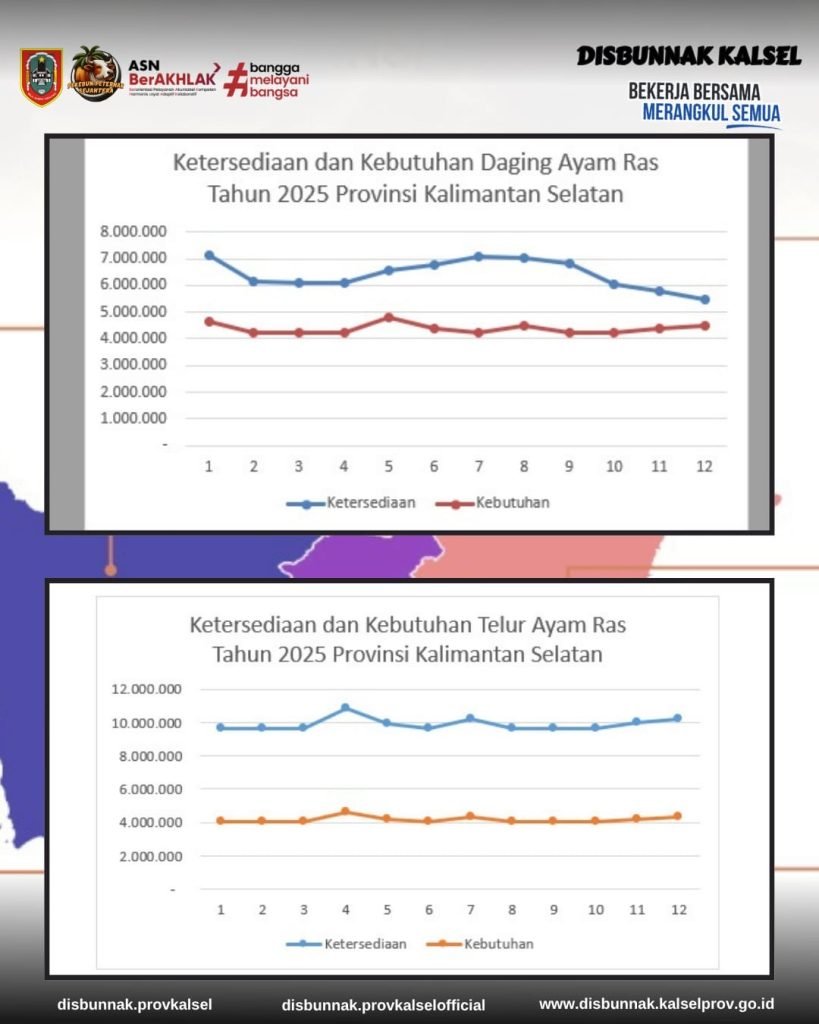 Berdasarkan hasil analisis data ketersediaan dan kebutuhan pangan strategis, Provinsi Kalimantan Selatan (Kalsel) mencatat kondisi surplus untuk komoditas daging ayam ras dan telur ayam ras pada bulan September 2025. Kondisi ini menandakan bahwa pasokan pangan hewani di daerah tersebut berada dalam keadaan aman dan mencukupi kebutuhan masyarakat.