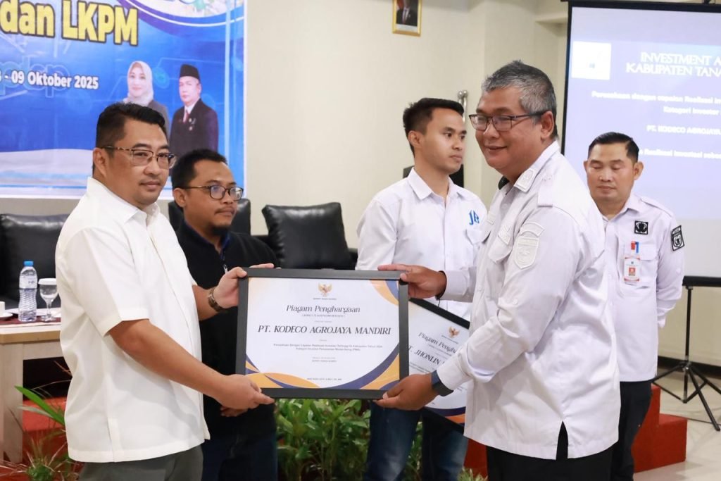 Sebagai bentuk apresiasi atas kontribusi dunia usaha, Pemerintah Kabupaten Tanah Bumbu melalui DPMPTSP menyerahkan Piagam Penghargaan Realisasi Investasi Tertinggi Tahun 2025 kepada dua perusahaan, yakni PT. Jhonlin Baratama untuk kategori Penanaman Modal Dalam Negeri (PMDN) dan PT. Kodeco AgroJaya Mandiri untuk kategori Penanaman Modal Asing (PMA).